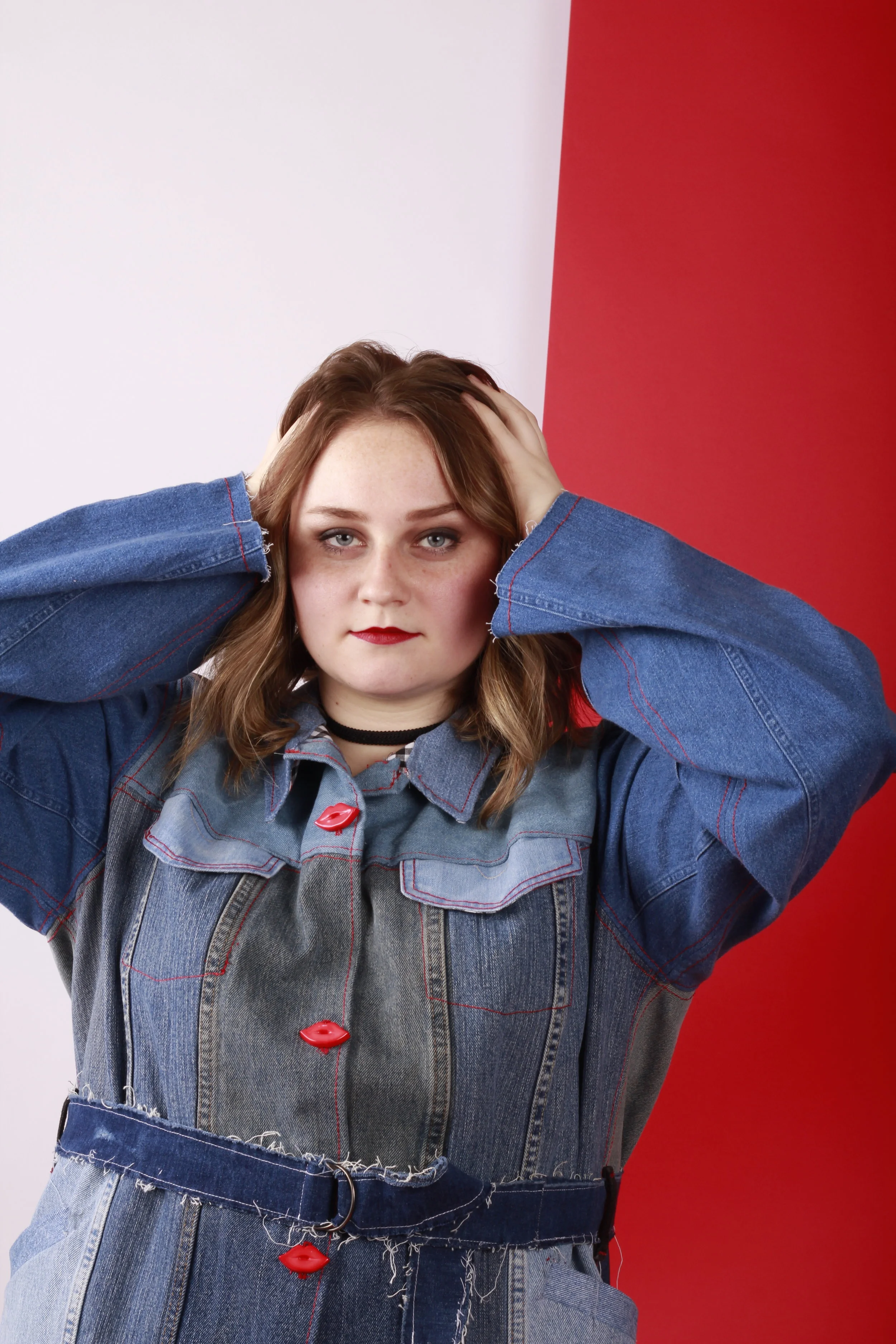 Conceptually, I am reflecting on celebrating women’s individuality. My materials will be a symbol for this theme, as I mix several upcycled denim textiles with a variety of patterns. The clash of mixed textiles allows this collection to represent the idea of women coming together in unity, without sacrificing their individuality. The prints I am using have a sense of cheeriness and whimsy to them. I believe these kitschy prints can also add to elevating the wearer’s mood, and evoke happiness when worn. The main motif pulled from these prints is red female lips, symbolizing embracing women’s femininity and the idea of being able to speak up for yourself.
